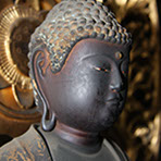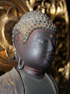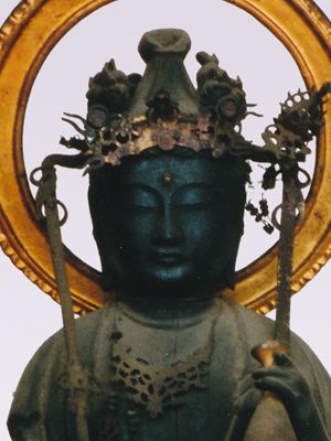 明治初年の神仏分離令により、諏訪大社関係の別当寺が廃寺となるなか、当山へと難を遁れた仏像の一つです。元は下社秋宮の別当寺・三精寺の本尊であったとされます。像全体が黒褐色になっているのは、護摩の焼煙によるものとされています