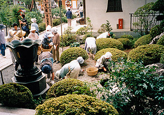 春の日限地蔵尊例大祭、夏のおせがき、秋の書道展を迎える前に、境内の清掃が行われます。菩提寺を護持するのは、檀徒各家の務めであるという、篤いご奉仕によるものです。